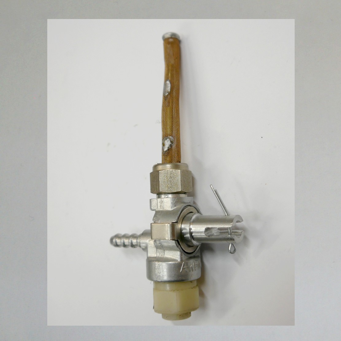 Dieser AW Benzinhahn hat einen Flach-Drehschieber und eine Korkplatte mit Löchern zum Abdichten.