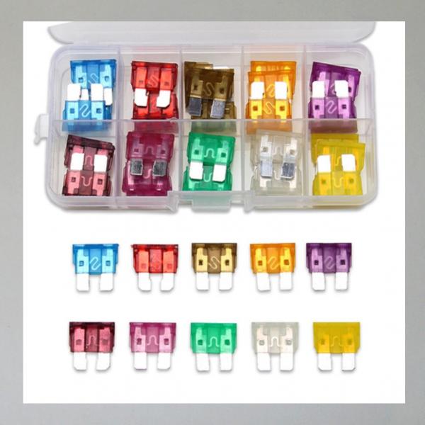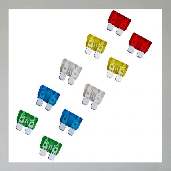 Sortiment mit 10 Flachsicherungen, Autosicherungen moderne Bauform, 10 verschied. Werte, jede Sicherung 5x