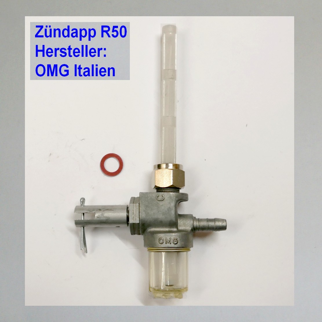 Benzinhahn für Zündapp R50 Roller, mit RE/LI-Gewinde M12x1 mit Reserve und Tankfilter---Repro von OMG---