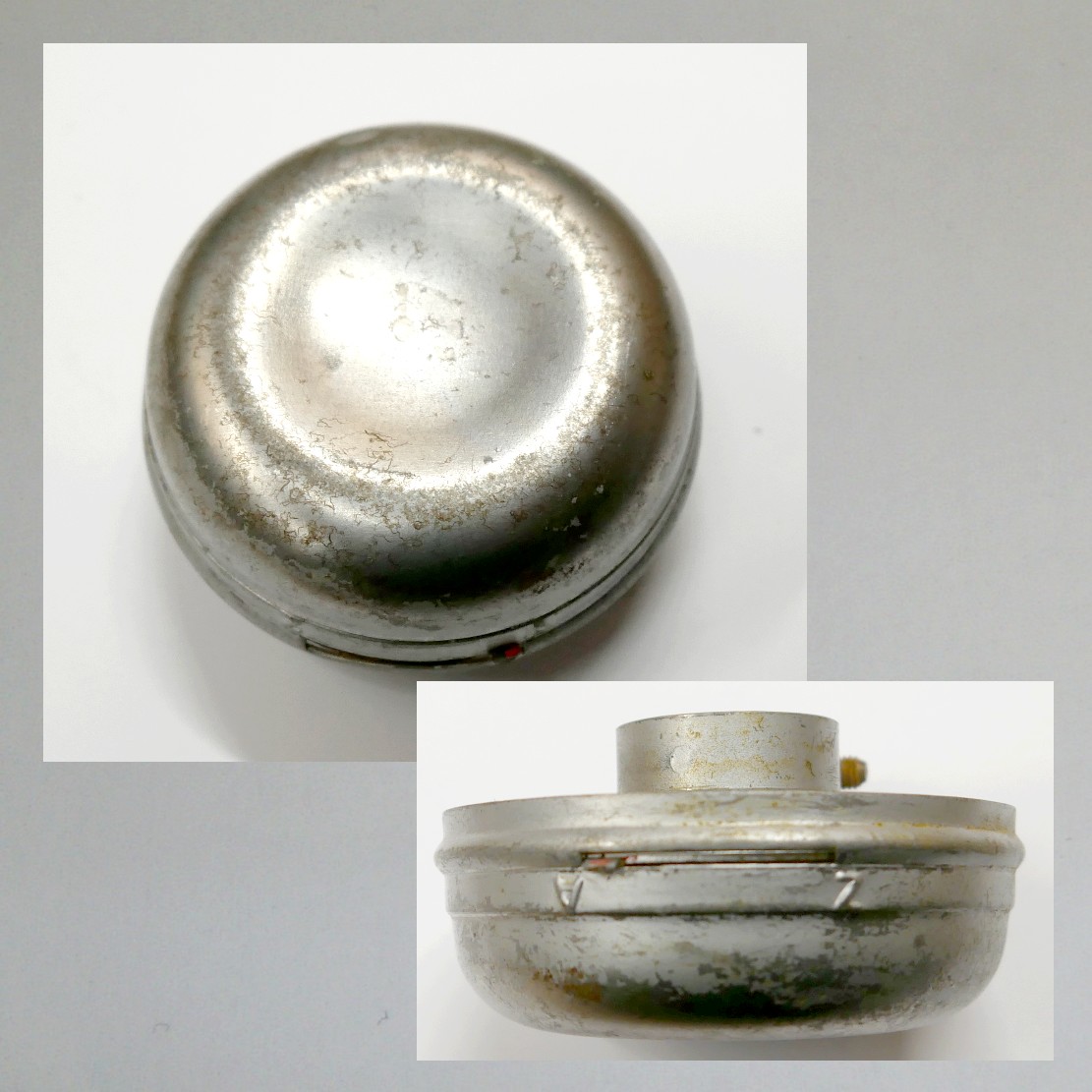 Die originale, benzinfeste, silberne Lackierung ist hier sehr dünn gewesen (normal viel dicker) und durch jahrelange Lagerung
